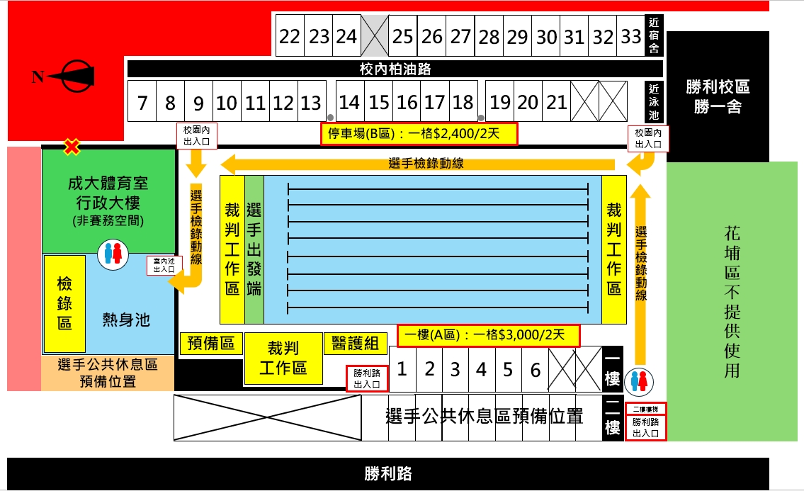 - 本賽事場地空間有限僅規劃33格賽事預備空間,欲登記單位專屬休息區之隊伍,請在開放登記時間前往國立成功大學勝利校區體育室一樓大廳登記,並繳交休息區設備租借費與清潔費,(選手公共休息區預備空間,無須事先登記,但無提供吊扇或立扇),各單位亦可多加運用!!。* 休息區位置有限、登記額滿為止。