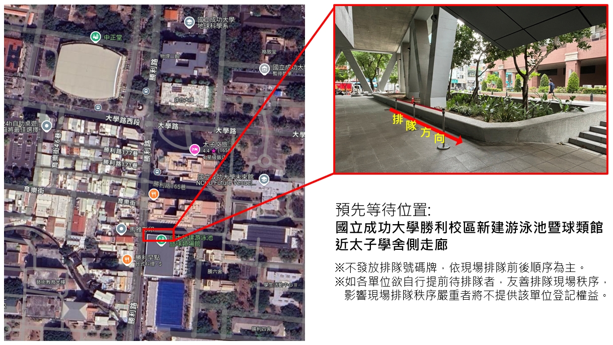 - 本次採用現場登記繳費,依登記當天現場排隊順序進行休息區登記及繳費,本次登記依現場排隊順序不會發放號碼牌,如各單位欲提前等待排隊煩請遵守排隊秩序,休息區登記後不退費(惟賽事停辦除外)